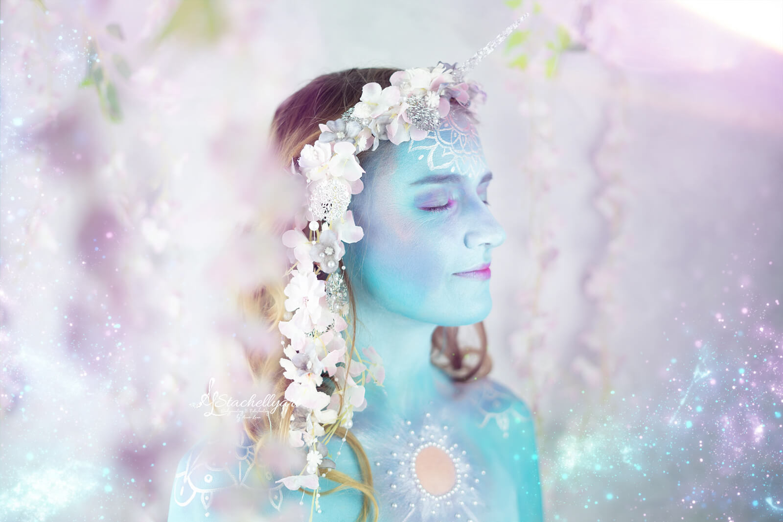 Während des Paintings wurde ich zu einem wundervollen Einhorn aus Wasser und Licht in strahlendem Blau. Auf meiner Haut entstanden einzigartige Mandalas, die fein, detailliert, wie zart gezaubert leuchteten. Jedes Symbol hat eine klare Botschaft. Die Mandalas stehen für die innere Ordnung, für das Zusammenspiel von Körper, Geist und Seele. Sie erinnern mich täglich daran, dass wahre Magie dort entsteht, wo wir uns in der Reinheit selbst begegnen.